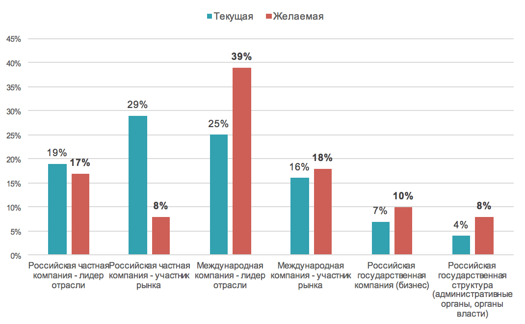 Рис.2. В какой компании вы хотели бы работать и работаете сейчас? (%)