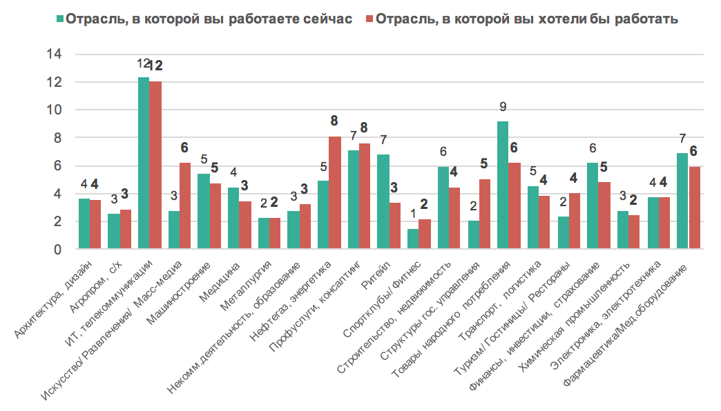 Рис.3. Укажите отрасль, в которой вы работаете и в которой хотели бы работать?